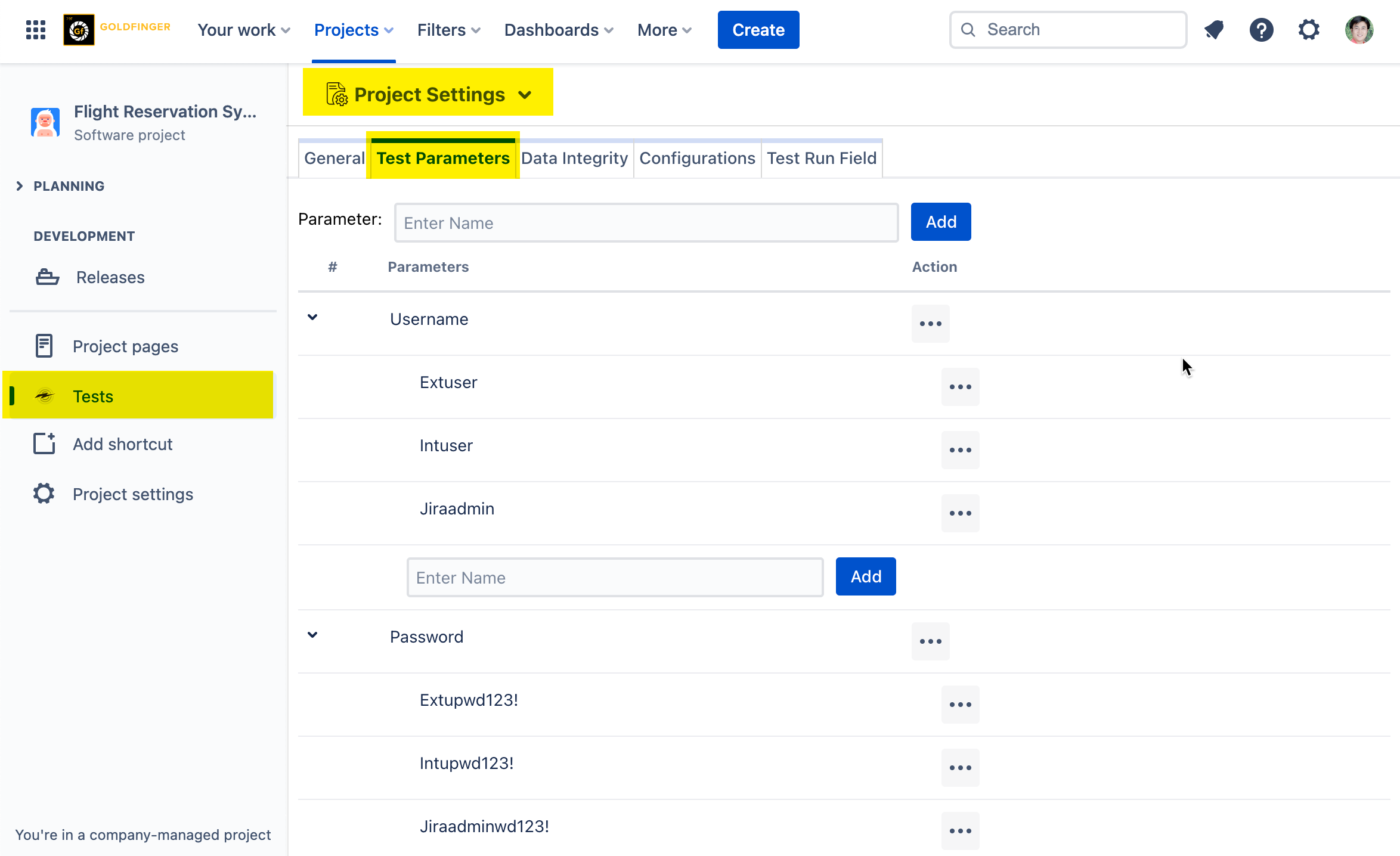 'Username' and 'Password' can be created and inserted into test steps when writing up a test case.